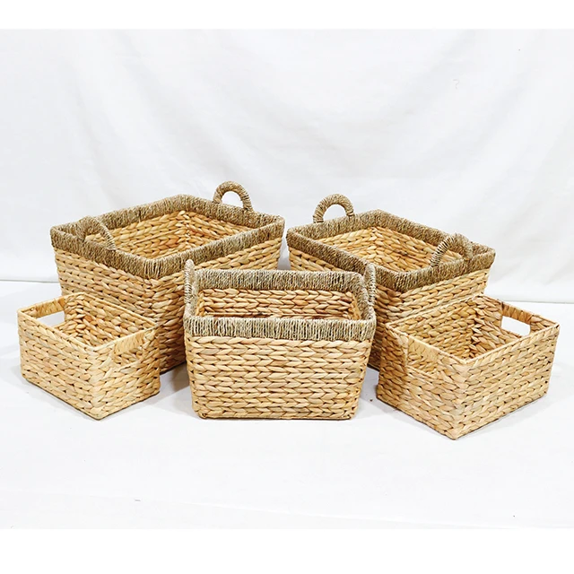 Artex Dong Thap Eco Friendly Rectangular Seagrass Basket with Decorative Rim and Dual Handles for Shelf Storage