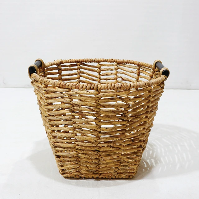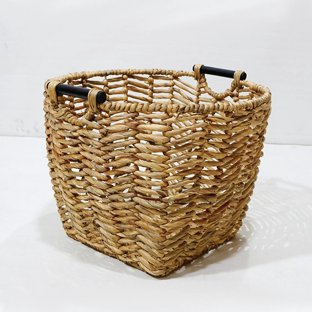 Artex Dong Thap Natural Water Hyacinth Basket with Wooden Handles Square Top Open Storage Bin for Home & Office Decor